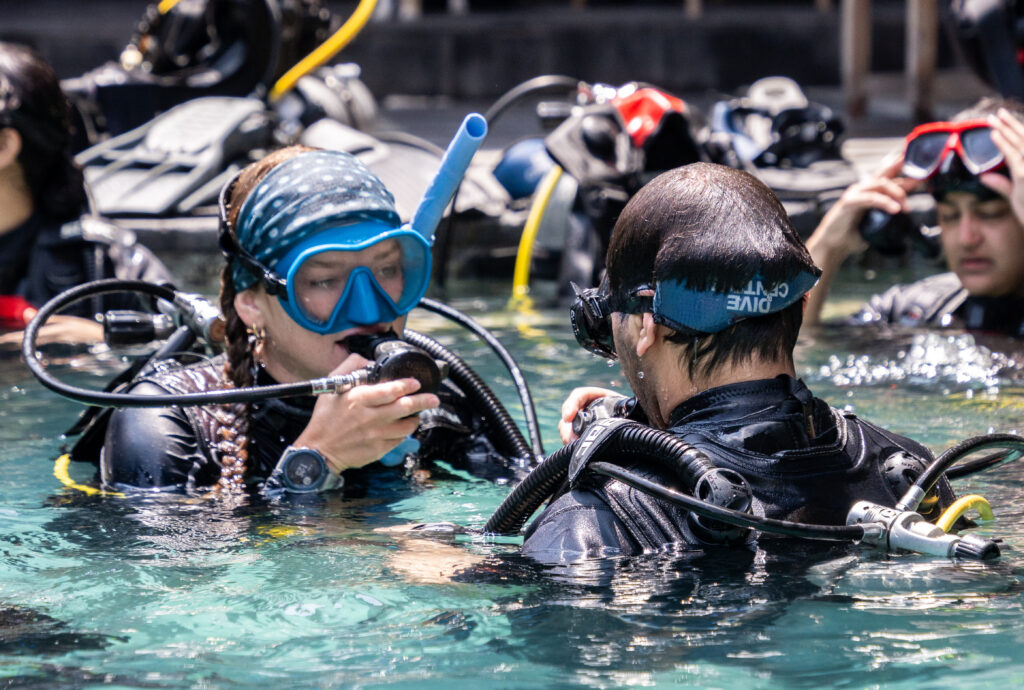 The goal is to make it as painless as possible. A quick pool session for an hour or so just to get you comfortable and then you’re off in the open water on a dive in no time!Ā