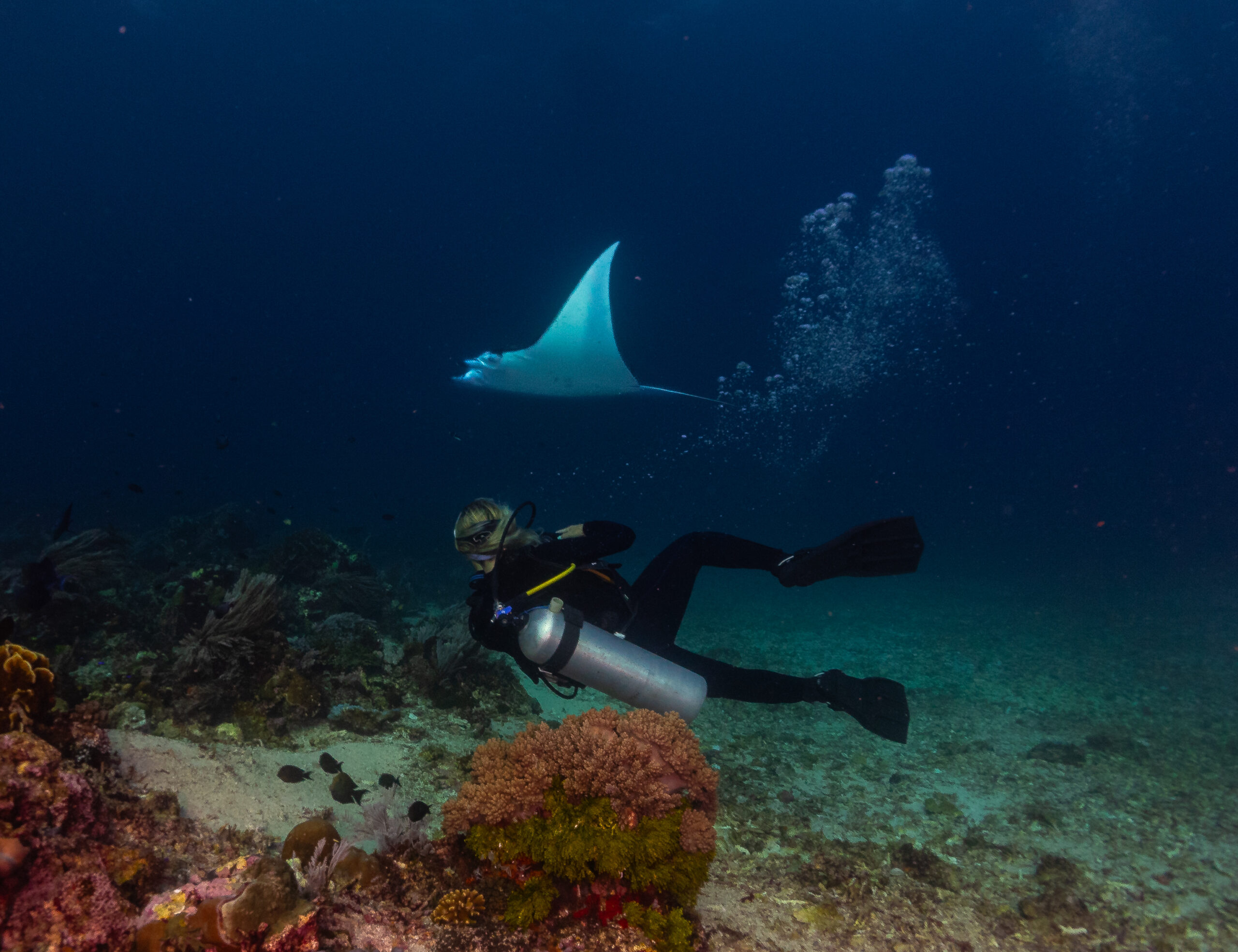Manta Point is a shallow cleaning station where reef mantas glide in to be cleaned by small reef fish. Visibility can vary because of plankton, but that plankton is exactly why mantas love this place. You can easily see multiple mantas circling above you, sometimes for the entire dive.