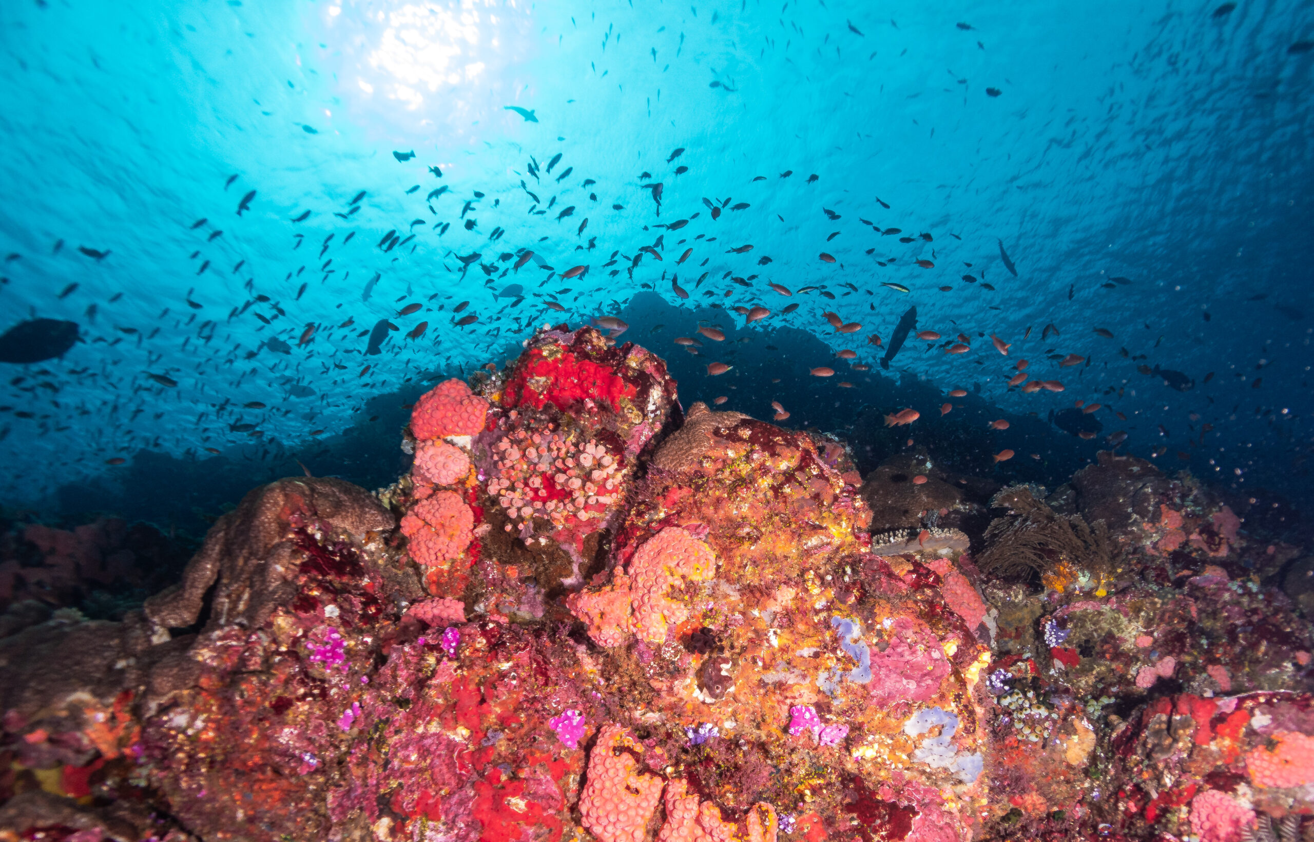 This dramatic pinnacle rises from the depths and is absolutely packed with life. Massive schools of fish, turtles, reef sharks, giant trevallies and clouds of anthias cover the reef. Currents can be strong, so this dive is usually done as a controlled drift, but the reward is one of the most vibrant reefs you’ll ever see.